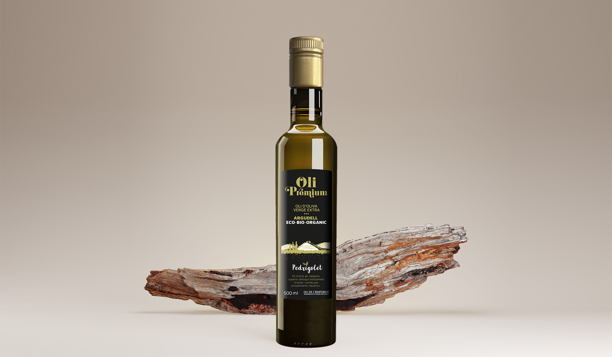 Per a les etiquetes de les ampolles, s’ha desenvolupat una proposta gràfica única basada en una il·lustració del perfil de les muntanyes del Montgrí, un element icònic del paisatge empordanès. Aquesta línia de muntanyes es representa amb una base gràfica natural on hi predominen xiprers i vegetació, reforçant la connexió directa amb l’entorn. Les tres muntanyes es diferencien cromàticament: la central es pinta amb un to ocre, evocant el color daurat de l’oli, mentre que les dues laterals es representen amb dues tonalitats diferents de verd, aportant profunditat i harmonia al conjunt.