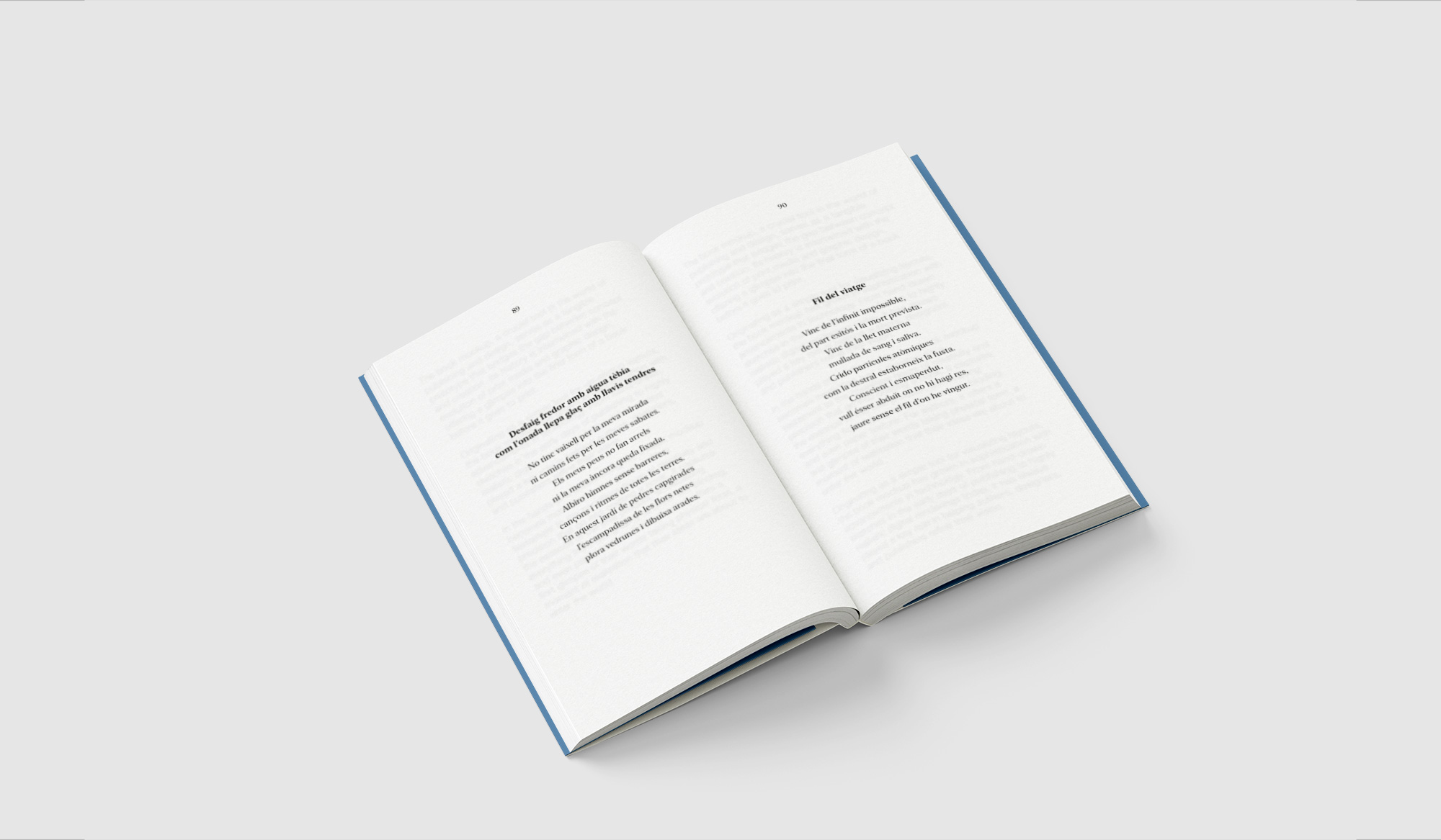 El text dels poemes es disposa també de manera centrada, accentuant la simetria visual i oferint una experiència de lectura pausada i equilibrada. Aquest tractament reforça la dimensió reflexiva de l’obra i fomenta una relació íntima entre el lector i el text.