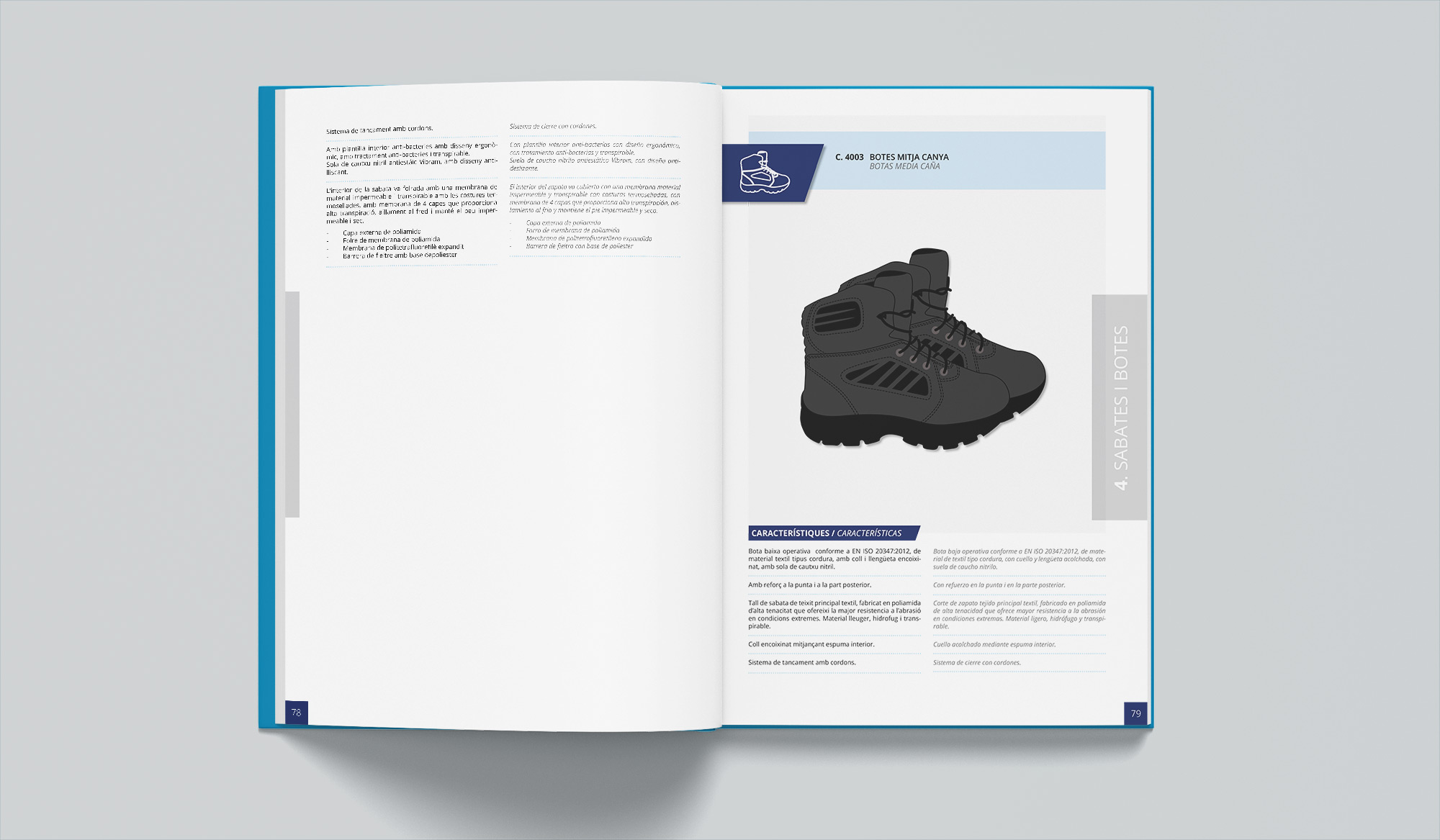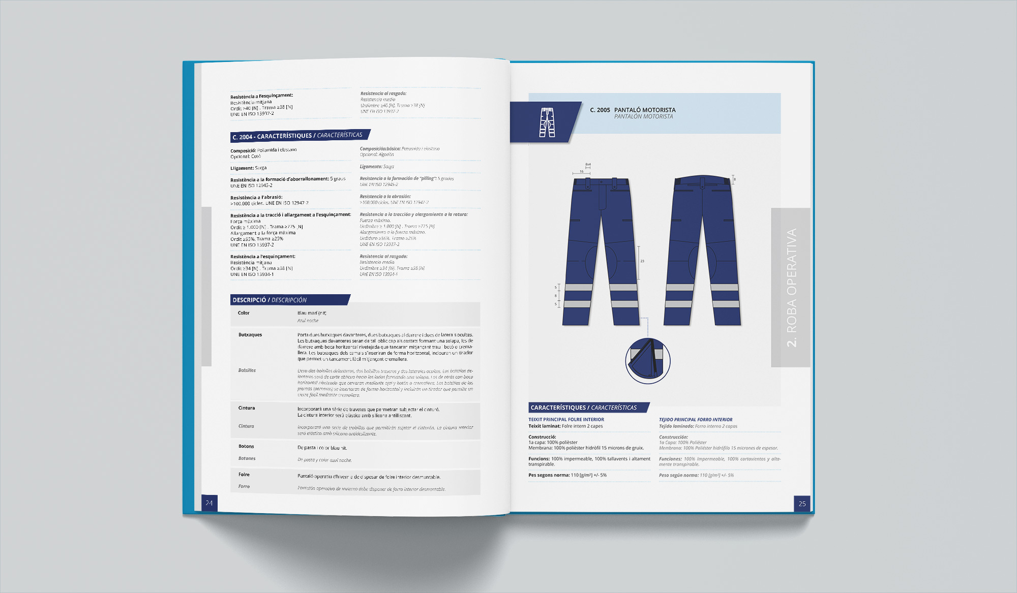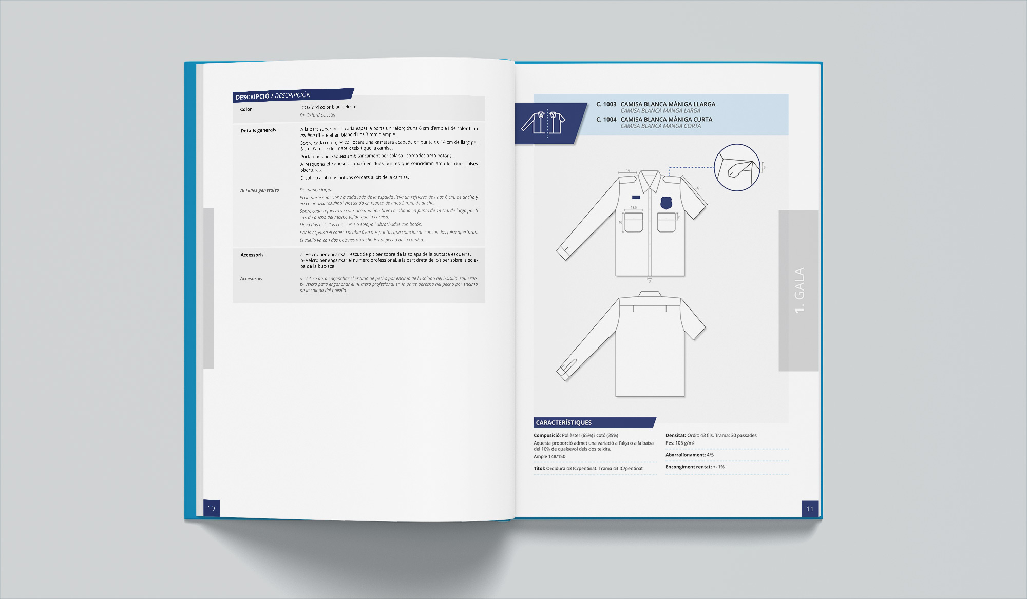 En aquest catàleg s’ha treballat la maquetació creant nosaltres les il·lustracions (vestuari, cascs, gorres, sabates, plaques, objectes…) per poder explicar de manera més visual les característiques de cada element. Un cop tancat el disseny s’ha creat un PDF per poder enviar a diferents empreses especialitzades en la confecció de vestuari professional /laboral per la licitació de la realització de tots els elements.