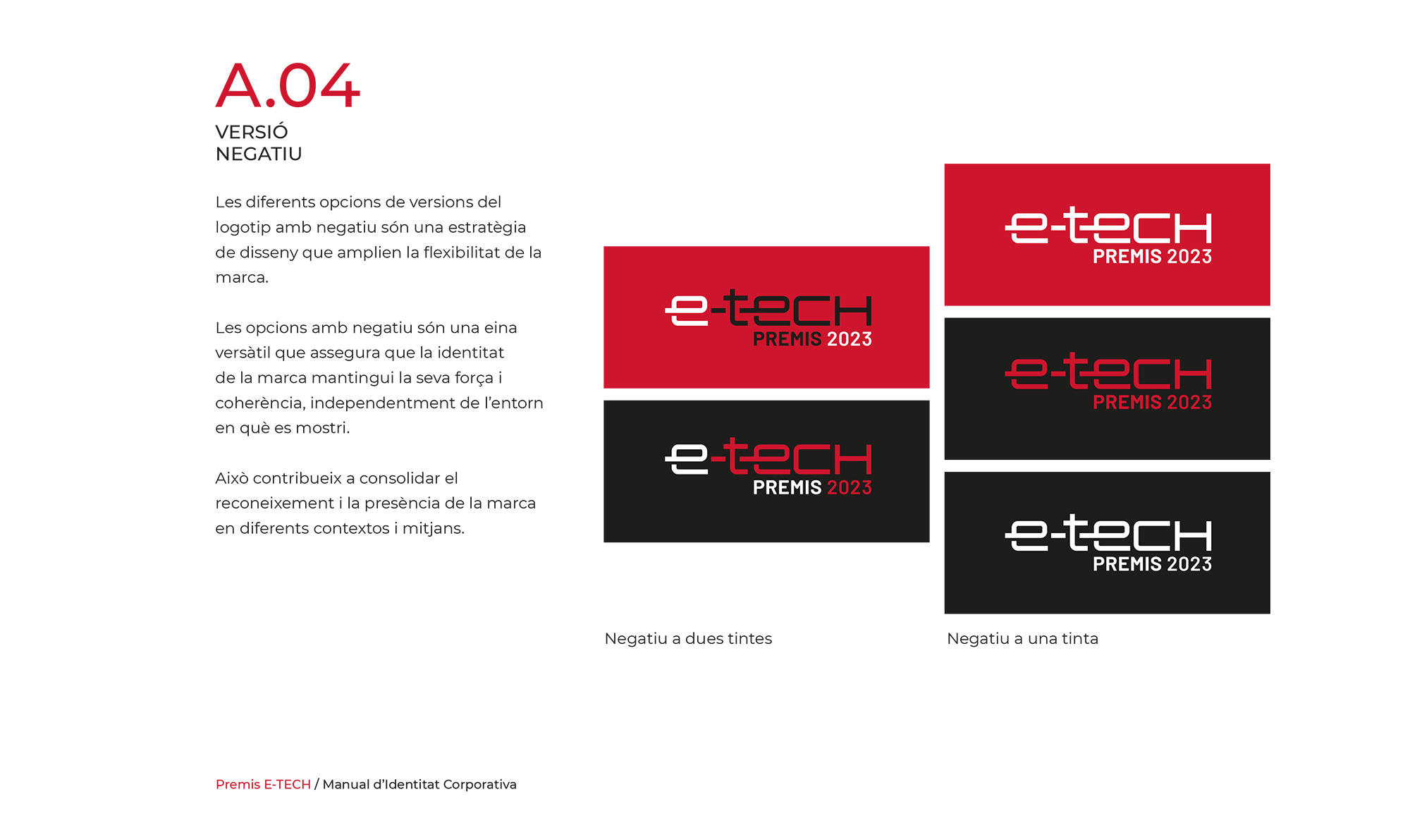 En primer lloc, hem desenvolupat un logotip més net, modern i minimalista. La tecnologia es tracta d’innovació i avançament, i ho reflectim amb una línia horitzontal que enllaça les primeres lletres d’E-TECH per transmetre la sensació de progrés i evolució, amb un aspecte professional que sigui fàcilment reconeixible i tingui una qualitat intemporal.
