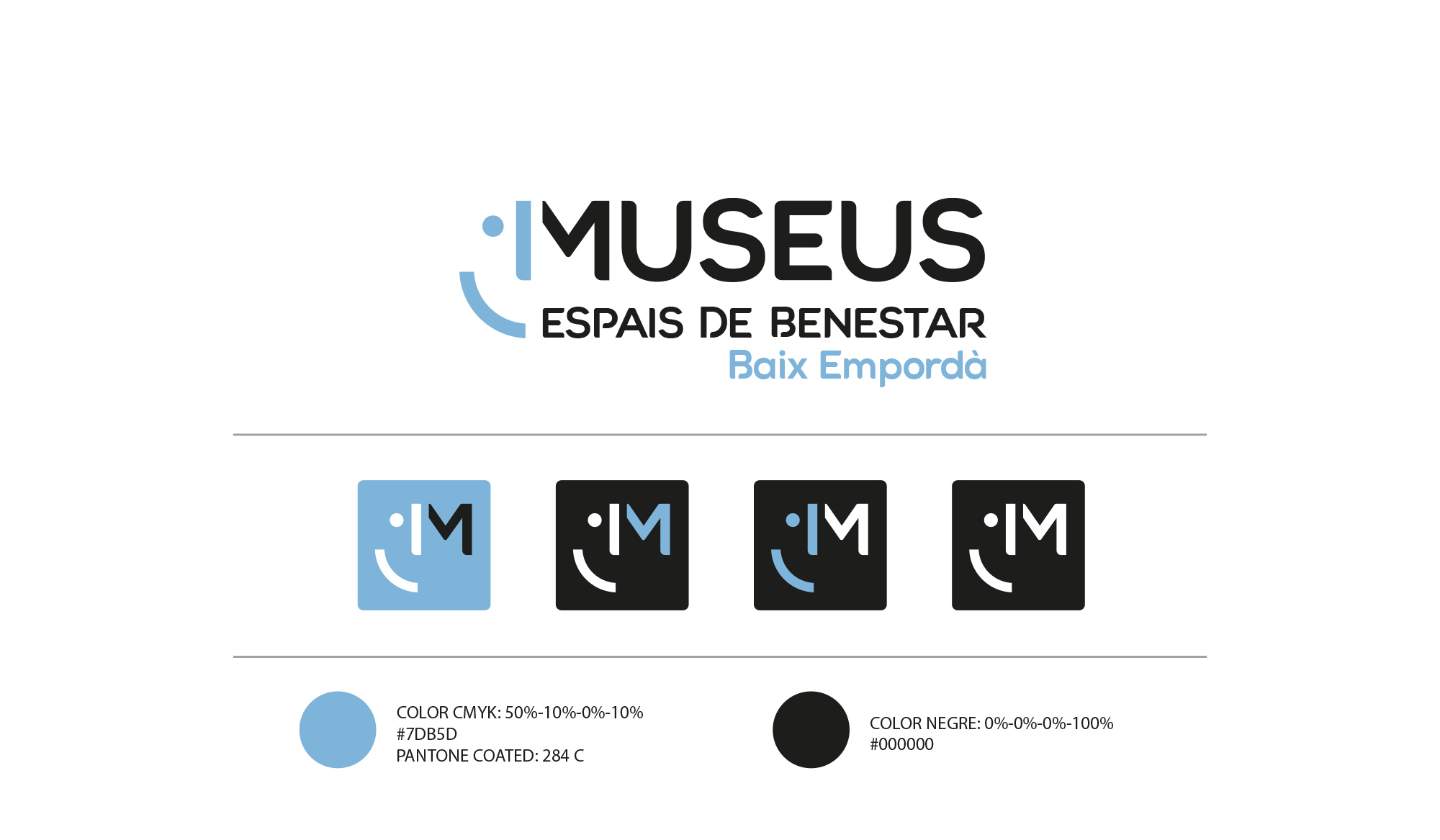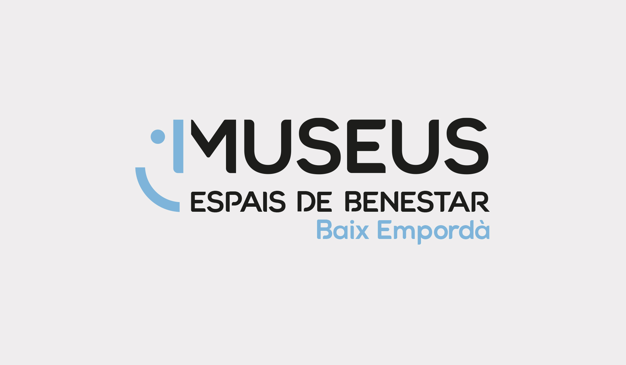 El disseny utilitza un color blau clar per al gràfic facial, evocant tranquil·litat i confiança, mentre que el text es presenta en negre per garantir llegibilitat i professionalitat. El text “Museus Espai de Benestar” ocupa el lloc central, mentre que “Baix Empordà” es mostra amb menys importància, reforçant la identificació territorial sense restar protagonisme al concepte principal.