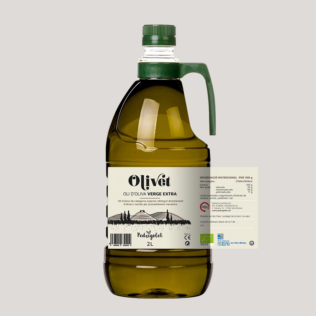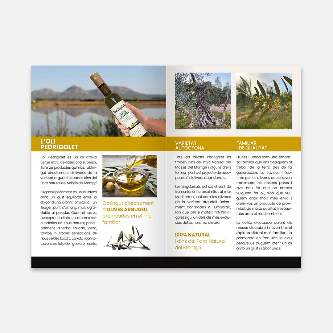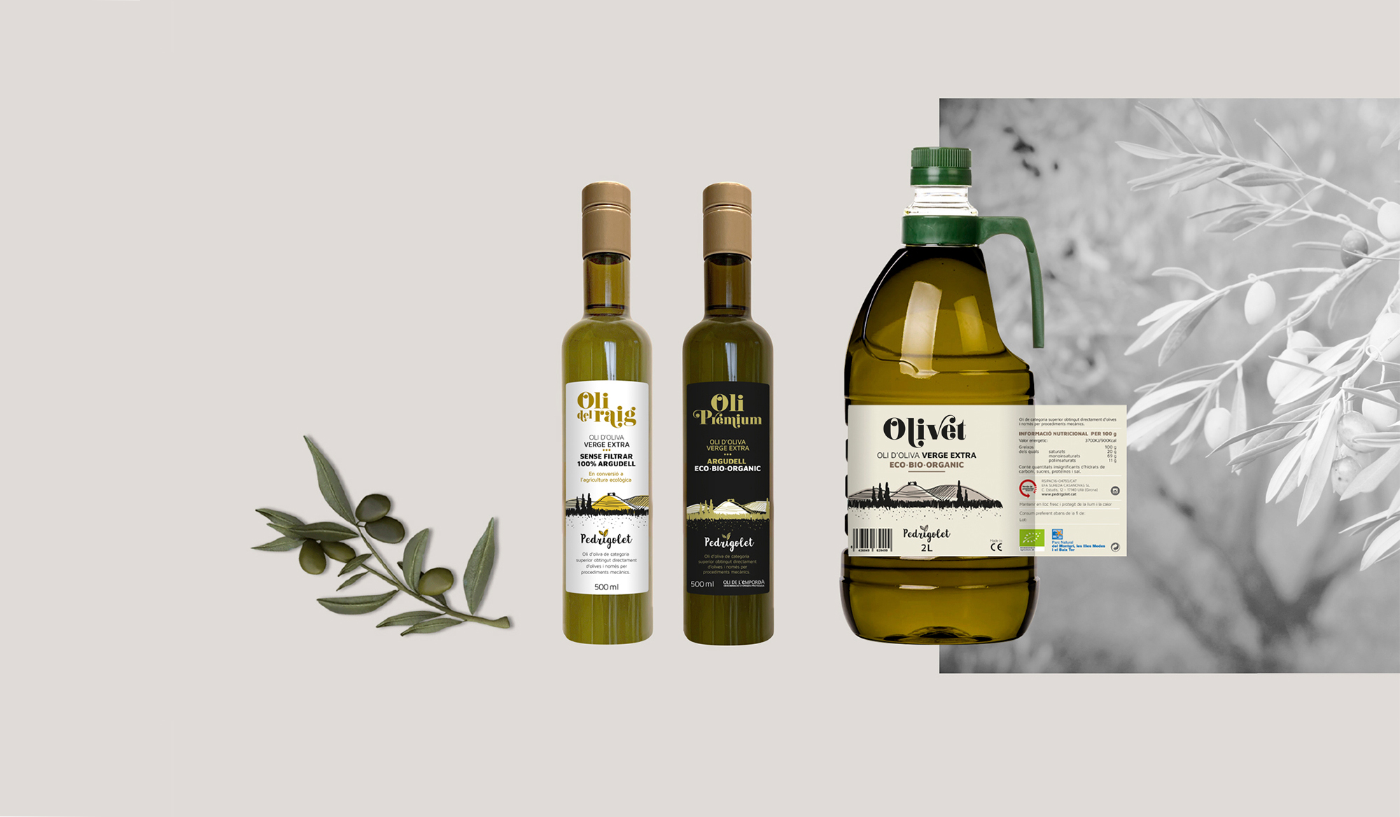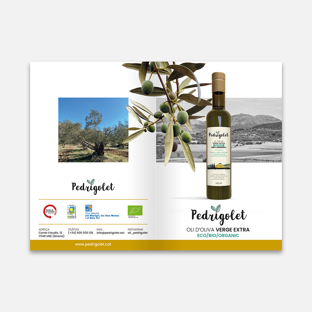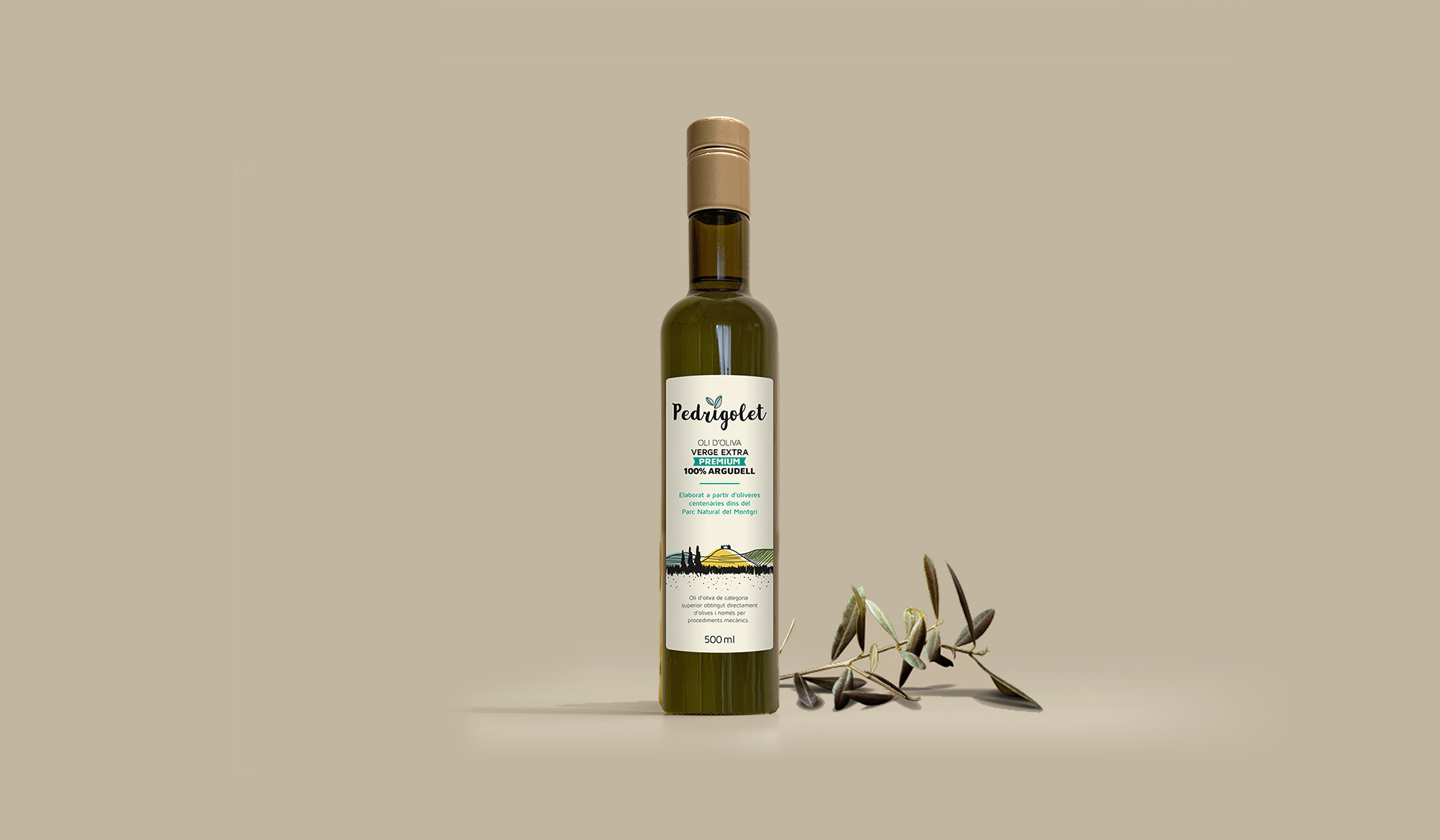 Aquesta combinació d’elements gràfics –tipografia manuscrita, fulles d’olivera i perfil natural del Montgrí– construeix una identitat visual coherent i amb personalitat pròpia. PEDRIGOLET no només es presenta com un producte de qualitat, sinó com una marca que reivindica l’origen, la terra i l’art de produir oli des d’una mirada respectuosa, cuidada i contemporània.