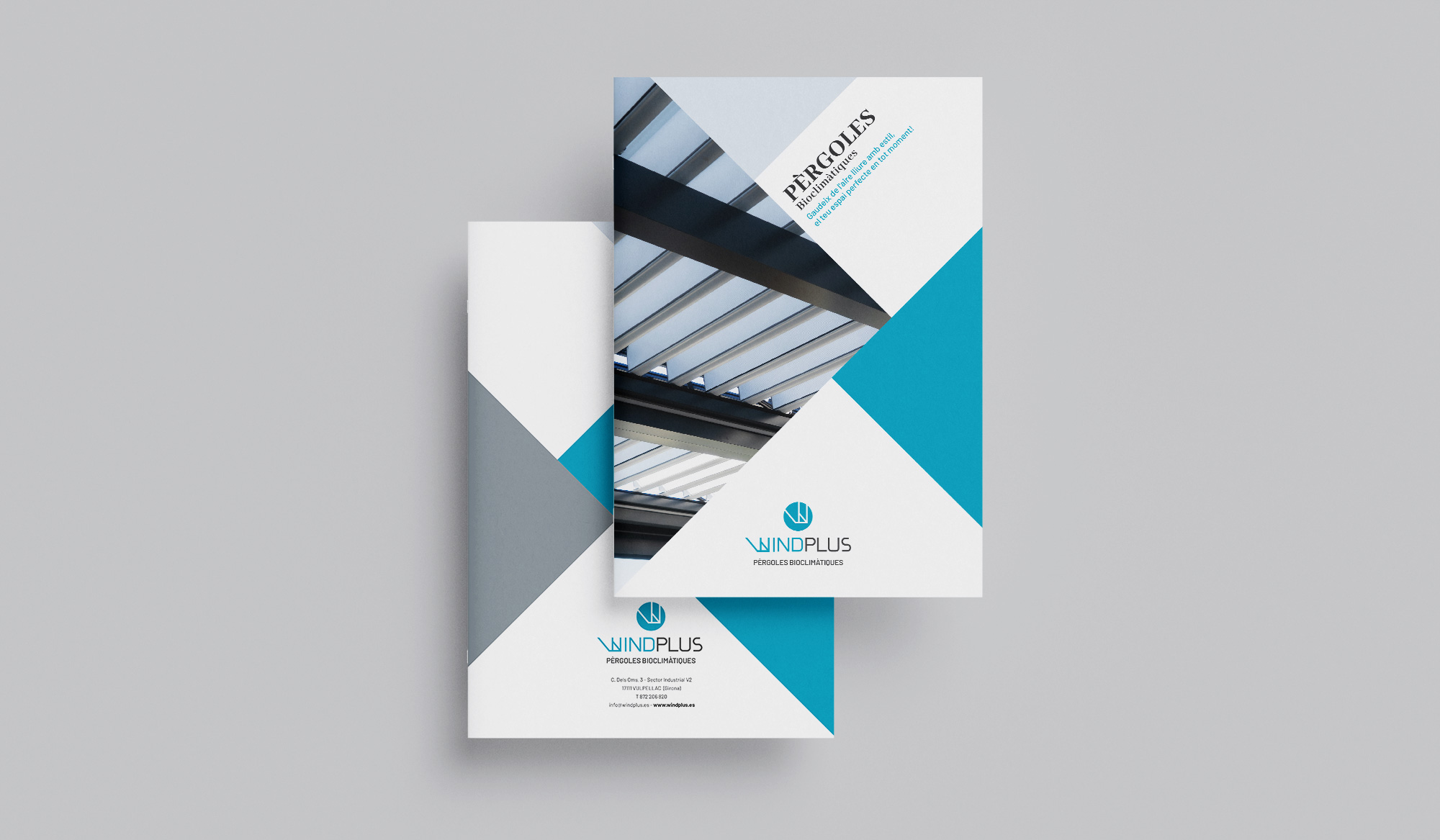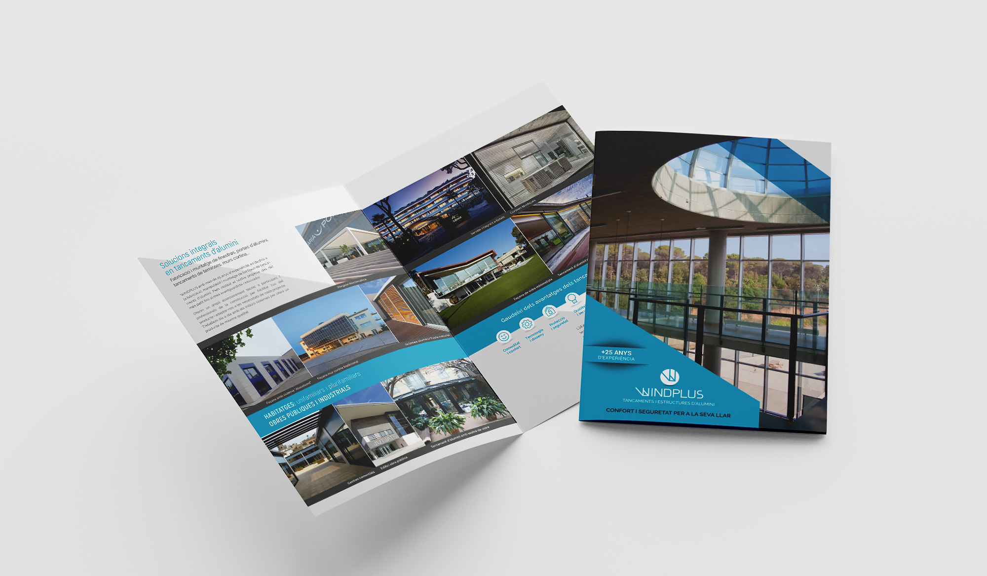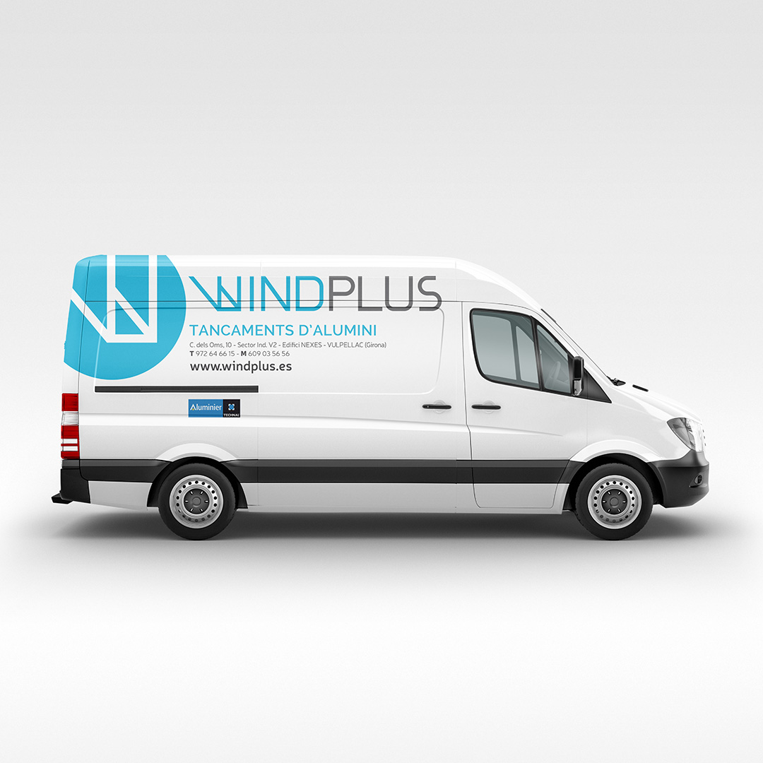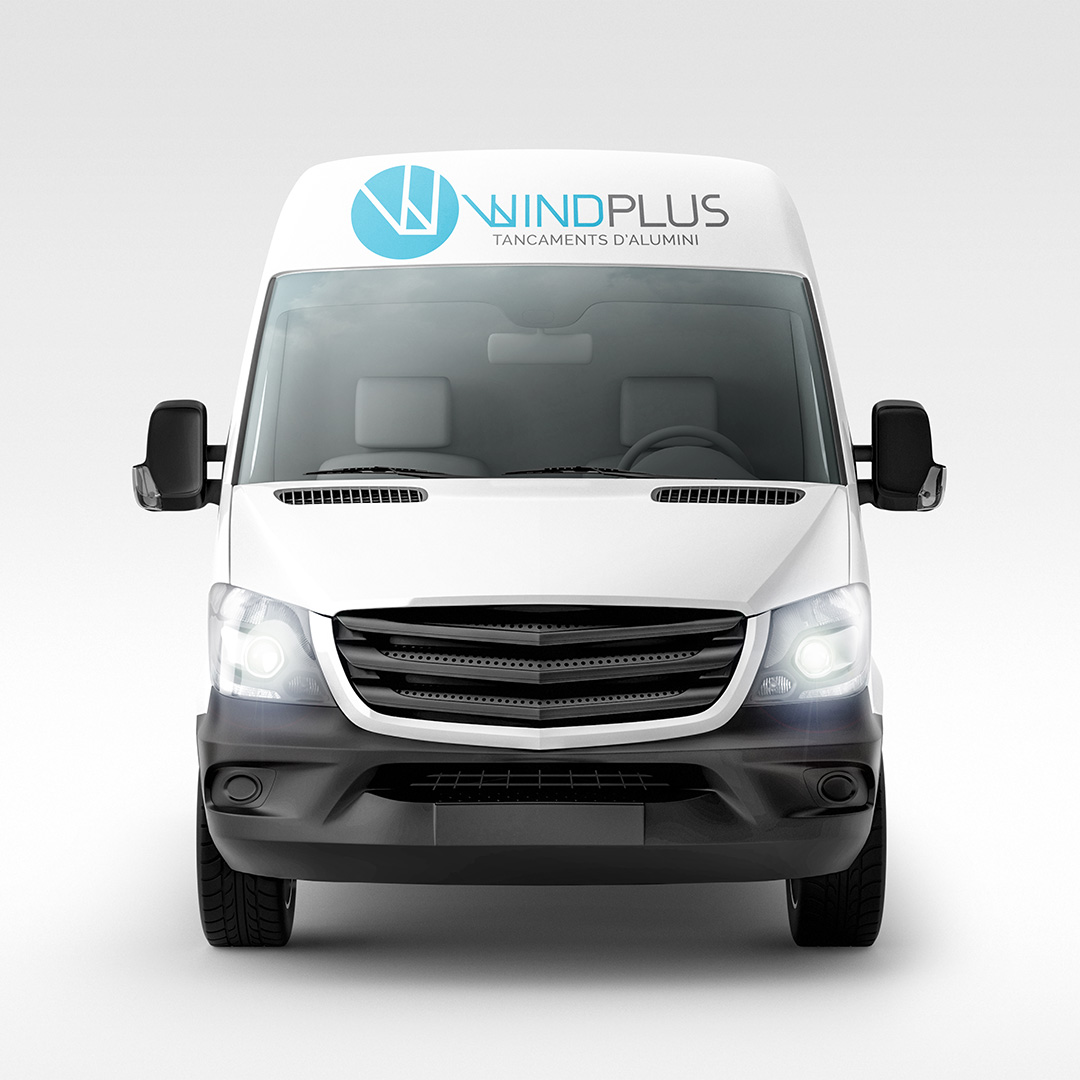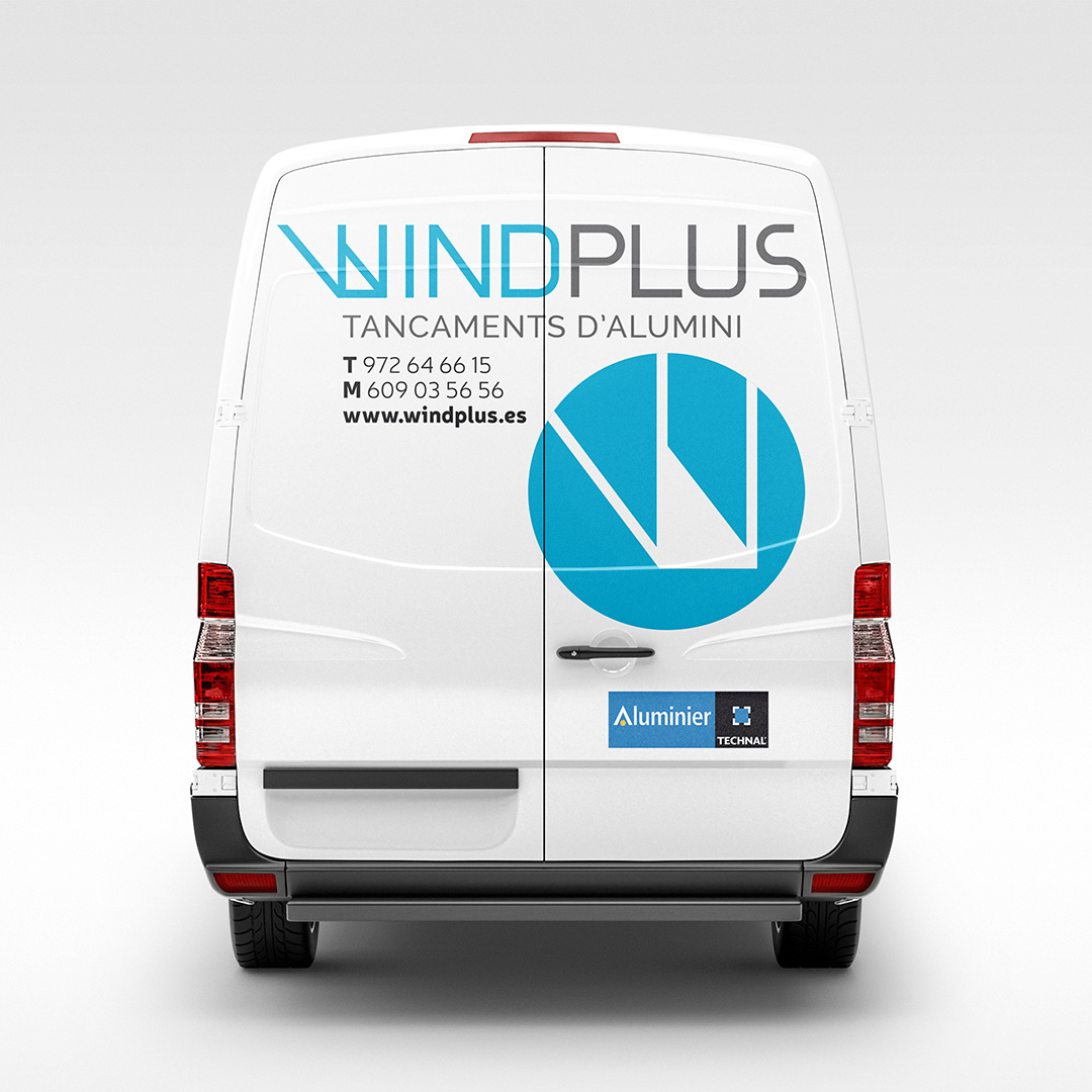 El símbol, sòlid i versàtil, funciona com a icona representativa en diferents suports i reforça el caràcter tècnic i estructural dels tancaments d’alumini. El color blau, utilitzat tant al símbol com a la paraula “WIND”, transmet valors com la confiança, la tecnología, i fa referència a l’origen del terme —derivat de “window”, finestra en anglès. Per contrast, el mot “PLUS” es presenta en gris fosc, afegint un to de serietat, estabilitat i qualitat, que reforça la personalitat de marca. La tipografia de pal sec, neta i contemporània, combina simplicitat amb caràcter, oferint una imatge moderna i professional.