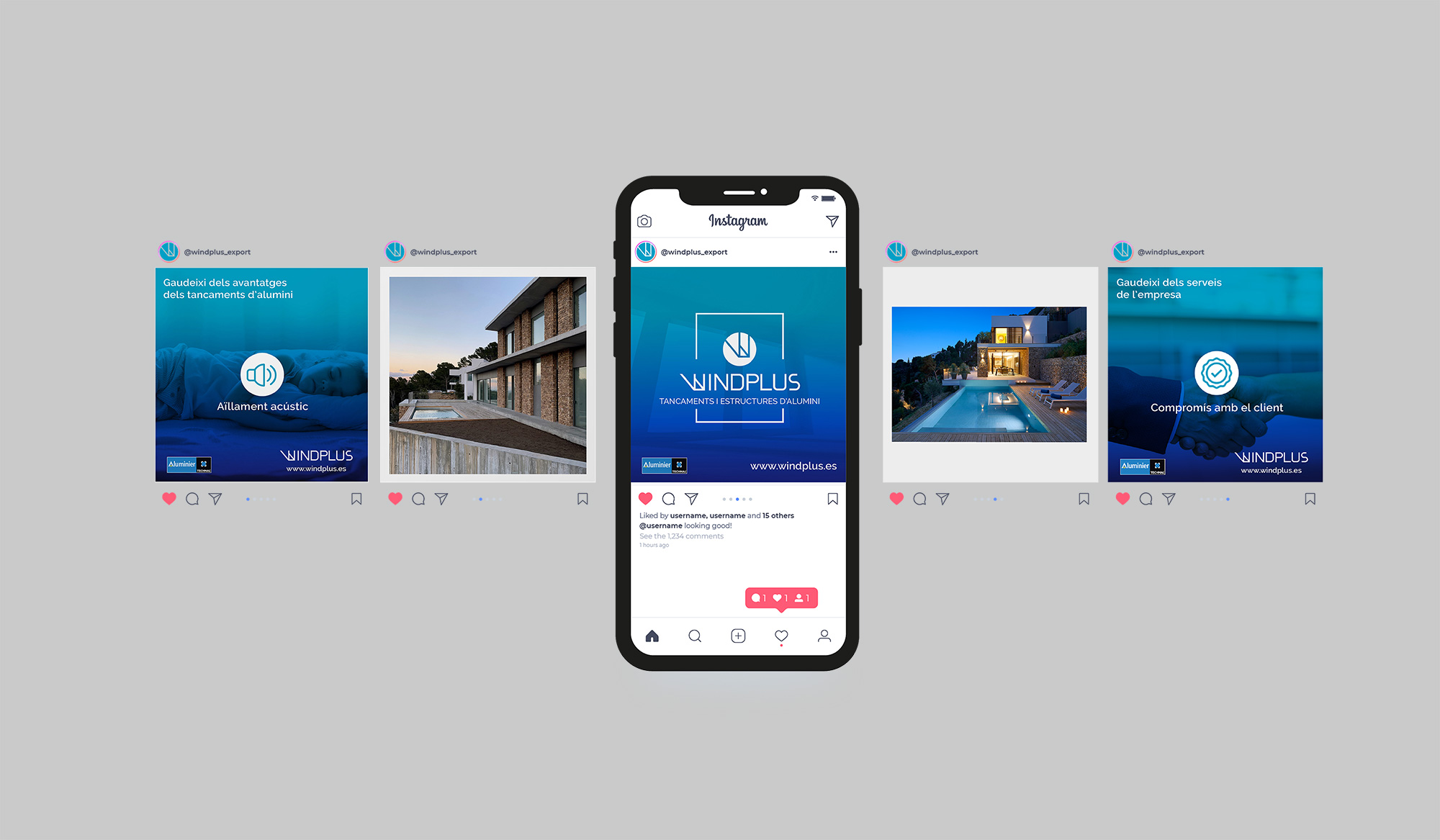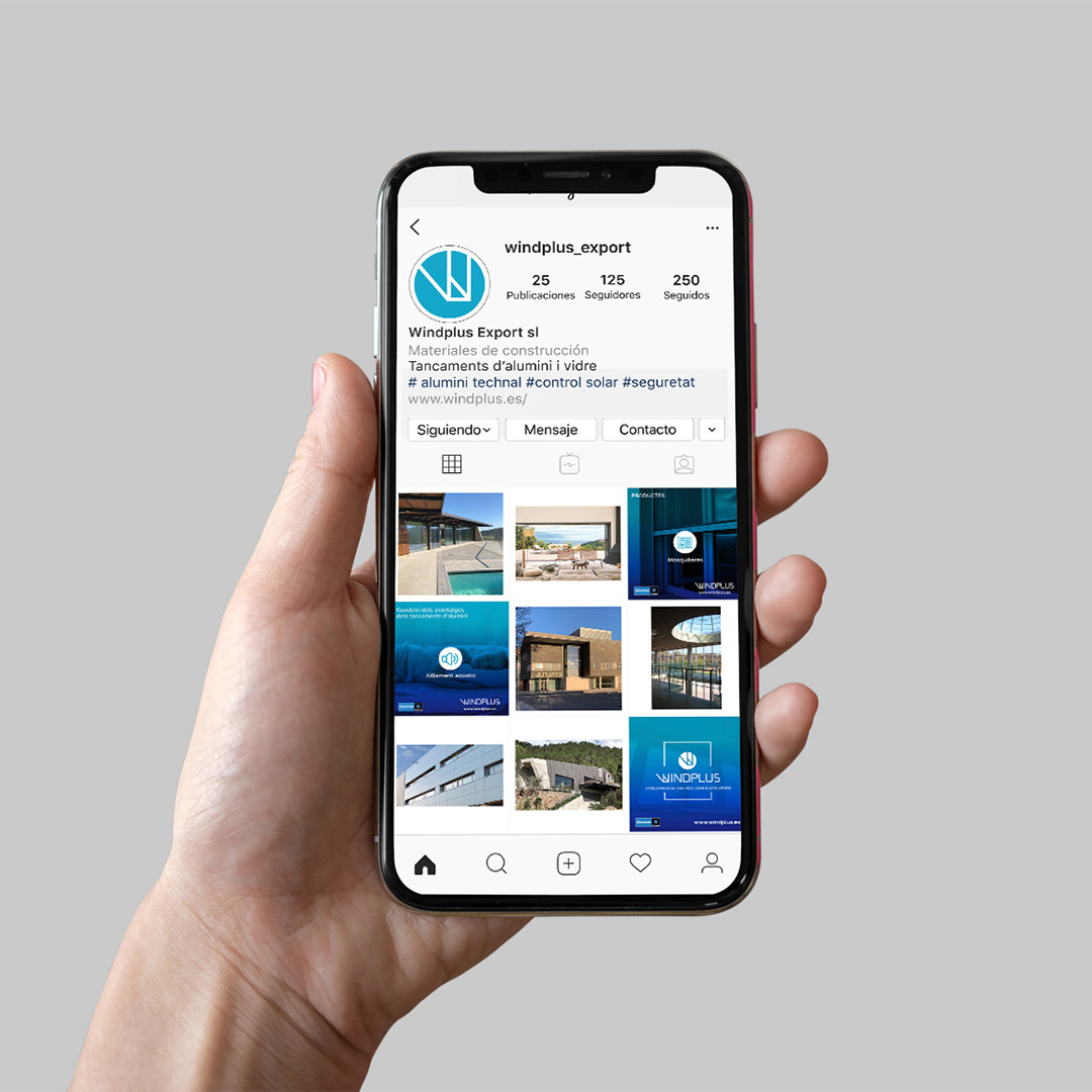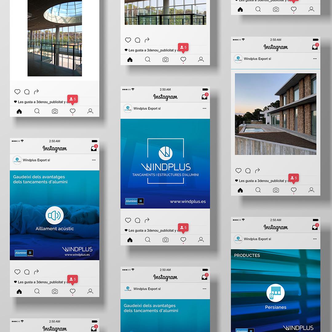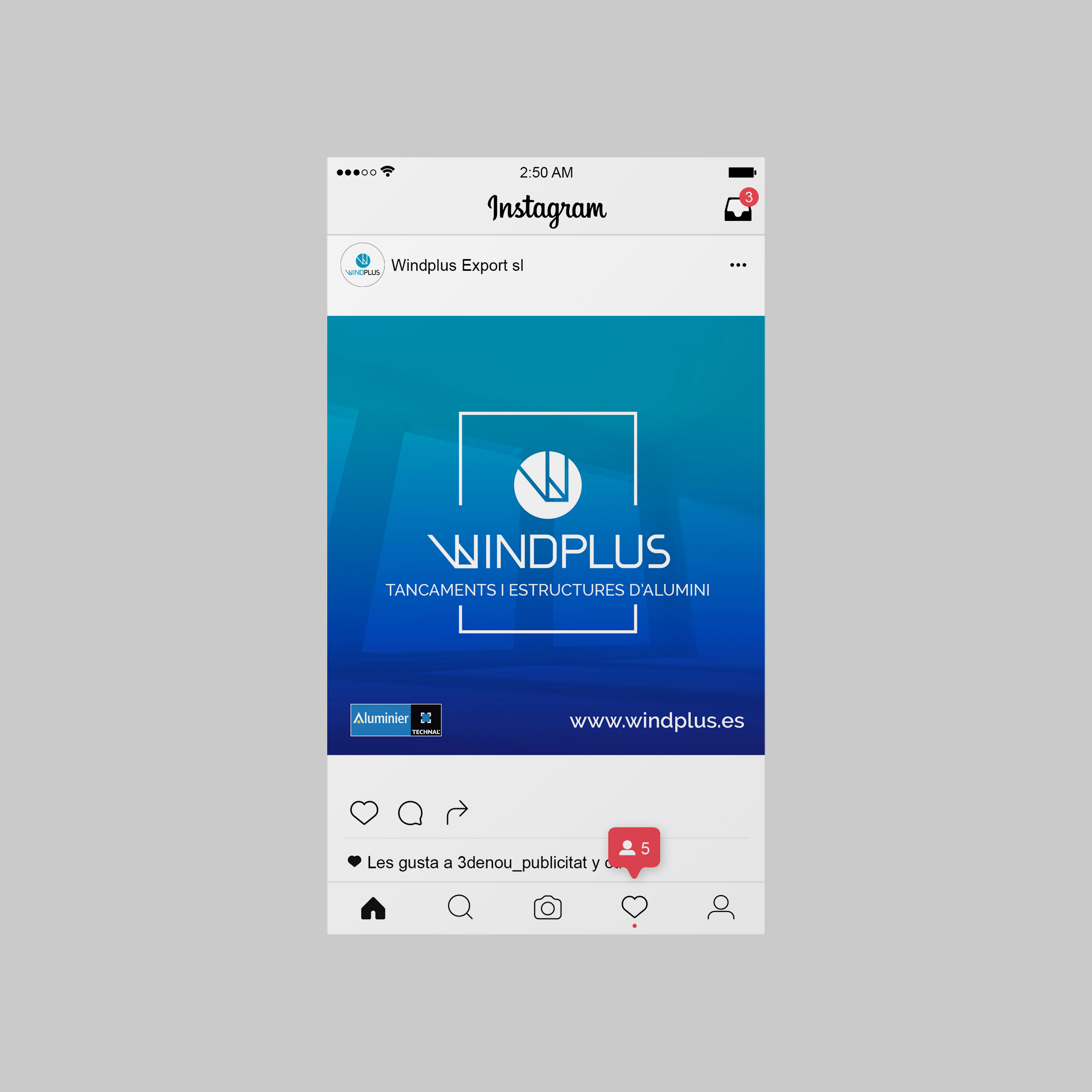 El símbol, sòlid i versàtil, funciona com a icona representativa en diferents suports i reforça el caràcter tècnic i estructural dels tancaments d’alumini. El color blau, utilitzat tant al símbol com a la paraula “WIND”, transmet valors com la confiança, la tecnología, i fa referència a l’origen del terme —derivat de “window”, finestra en anglès. Per contrast, el mot “PLUS” es presenta en gris fosc, afegint un to de serietat, estabilitat i qualitat, que reforça la personalitat de marca. La tipografia de pal sec, neta i contemporània, combina simplicitat amb caràcter, oferint una imatge moderna i professional.